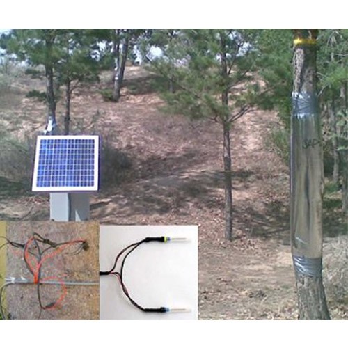 熱擴(kuò)散式探針法原理:恒定供熱給插入樹干邊材的探針,由于液流向上的運輸作用,理想狀態(tài)下,被液流帶走的熱量應(yīng)等于供給的熱量,通過對比參比探針的溫差電勢,可得出實時莖流。
