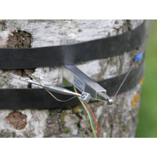 DC2樹干周長生長變化傳感器是DC1樹干周長生長變化傳感器的改進(jìn)版本。鋼絲繩的拉力改為徑向設(shè)置。這樣鋼絲繩對樹的壓力和樹徑無關(guān),不同樹徑的測量結(jié)果可直接比較。傳感器通過一個由熱膨脹系數(shù)低的合金制成的鋼絲繩固定在樹上。用小塑料環(huán)減少鋼絲繩對樹的壓力,并減少摩擦阻力,大大提高靈敏度。