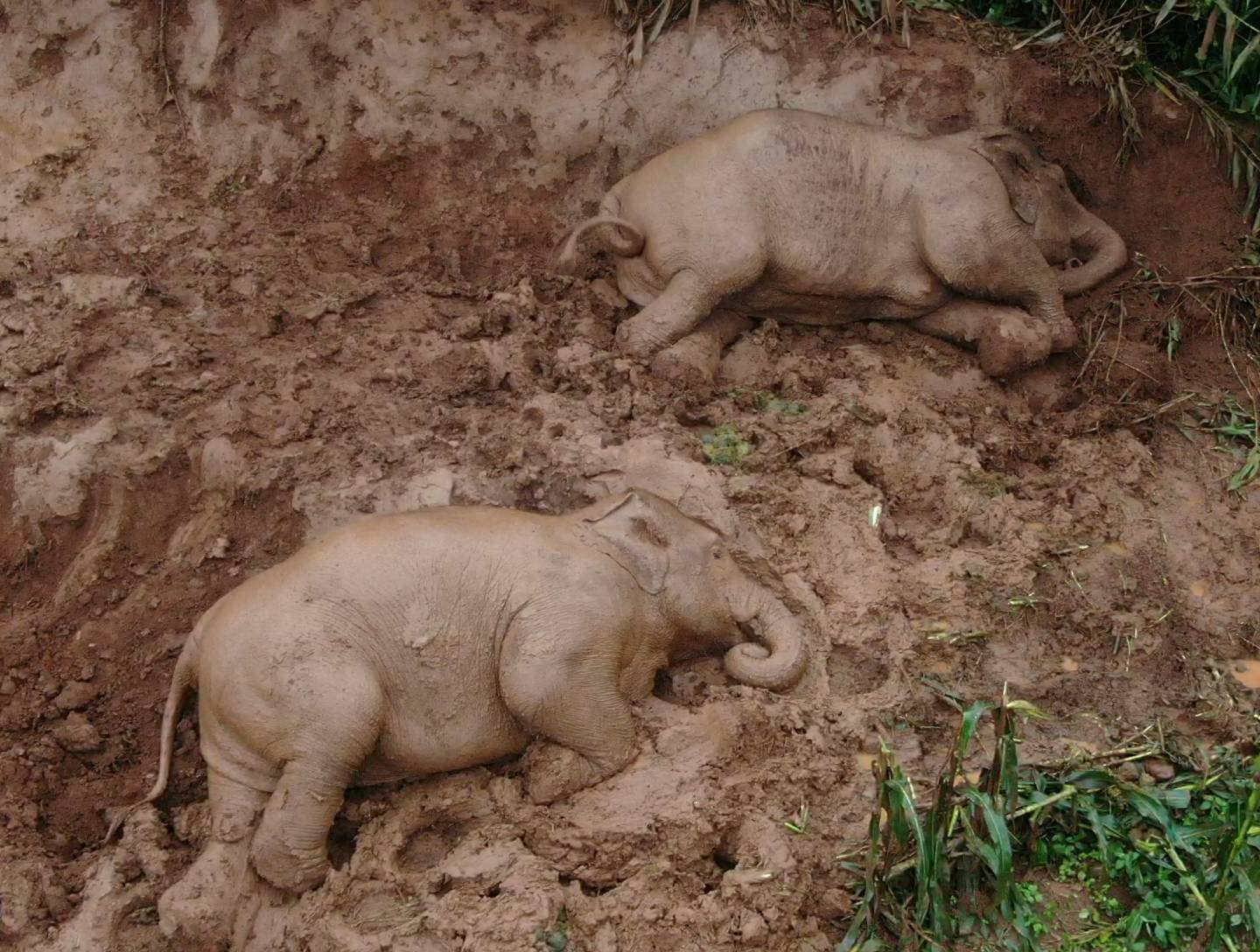 兩只亞洲象在上坡休憩。 課題組航拍于云南